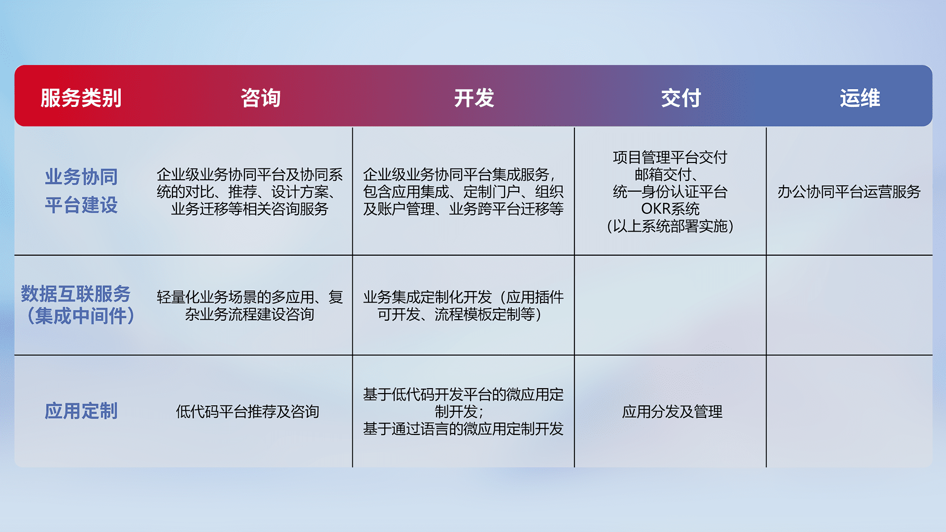 针对钉钉、、、企微、、、IDaas等平台级产品提供产品的规划、、方案、、、交付、、、、定制化开发等服务,,,实现如统一协同办公、、智能客户服务、、、混合会议管理、、、、智能数据查询、、、等业务场景,,,,实现数字化转型。。